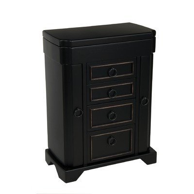 00311S10 Features: -Phoebe Upright Jewelry Box.-Distressed, raised moulding detail on drawer fronts.-Softly curved sides.-Lift lid features mirror, two bracelet hooks, and shirred catch pocket.-Top compartment offers one open section and four smaller divided sections.-Automatic tray with ring rolls.-Dual necklace doors with three hooks each.-Three open drawers and drop down ring roll compartment.-Antiqued brass ring drawer pulls and hardware.-Green sueded fabric lining.-Footed base. Color/Finish: -Black painted / antiqued rub-off finish.
